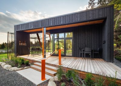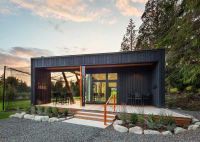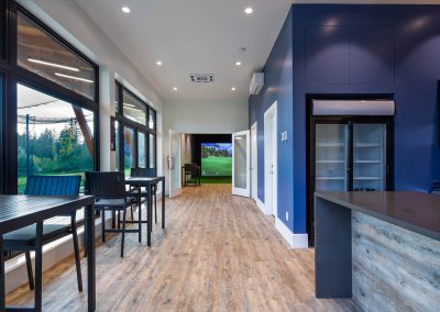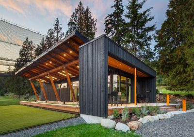 The newly built Tim Kerr Golf Performance Centre on Bowen Island is a modern West Coast-style gem featuring state-of-the-art golf swing analysis equipment, a lounge area, and a driving range platform.